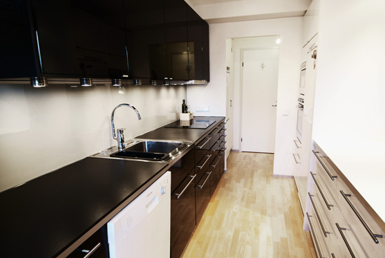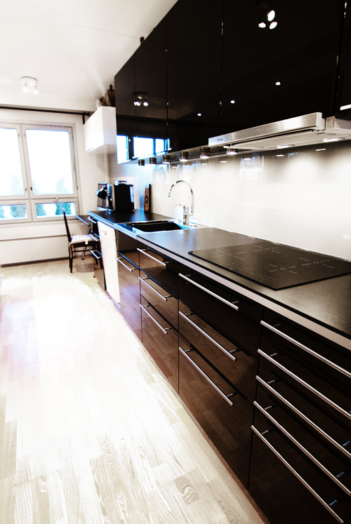 Asukkaat halusivat päivittää keittiönsä ilmeen ja saada keittiöstä avaramman ja toimivamman tilan. Remontissa uusittiin kaikki keittiön kalusteet ja tasot. Osa olemassa olevista kodinkoneista hyödynnettiin. Keittiöstä tehtiin avarampi ja avokeittiömäisempi purkamalla väliseinä osittain ja rakentamalla sen paikalle uusi, matalampi seinäke. Keittiöön rakennettiin myös kattokotelo, johon sijoitettiin spotit.