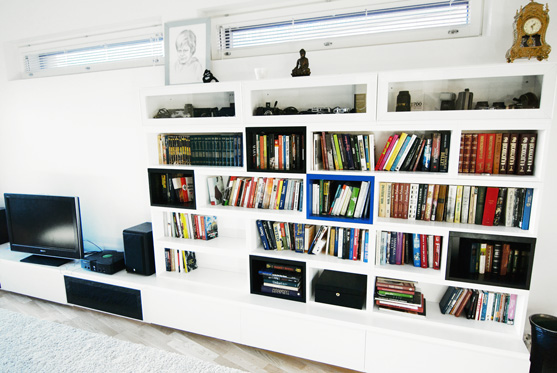 Asukkaat kaipasivat sisustukseensa viimeistelyä ja punaista lankaa - josta tällä kertaa tuli sininen. Erikoisen muotoiseen olohuoneeseen tilattiin mittojen mukaan epäsymmetrinen muhkea pörrömatto tuomaan mukavuutta ja kokoamaan kalusteita yhtenäiseksi kokonaisuudeksi. Asunnossa maalattiin useita sävyseiniä tekemämme värisuunnitelman mukaan. Sähkönsininen sävy ryhdisti olohuoneen ja sama väri poimittiin mukaan isoon kirjahylly- ja TV-kalusteeseen, joka suunniteltiin Muuramen moduuleista. Olohuoneen, keittiön ja makuuhuoneen valaistusta parannettiin ja eteiseen hankittiin uusi matto. Myös makuuhuone päivitettiin sävyseinällä sekä uudella sängyllä.