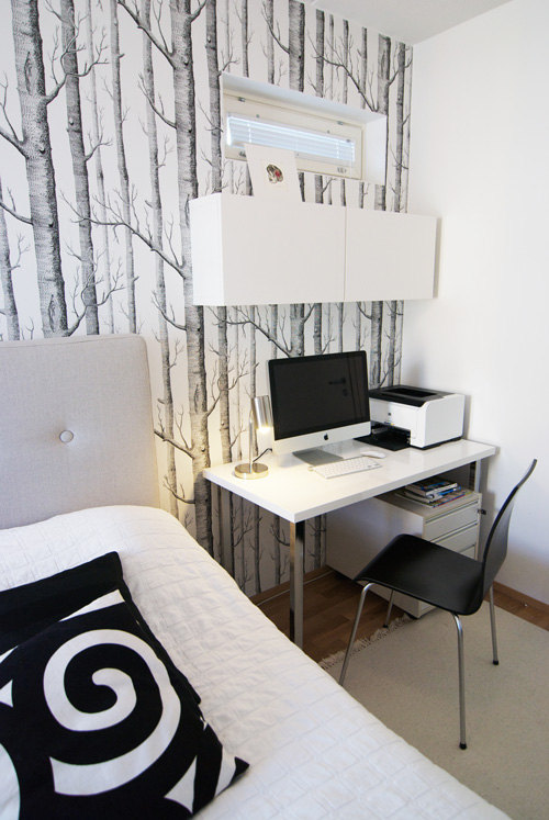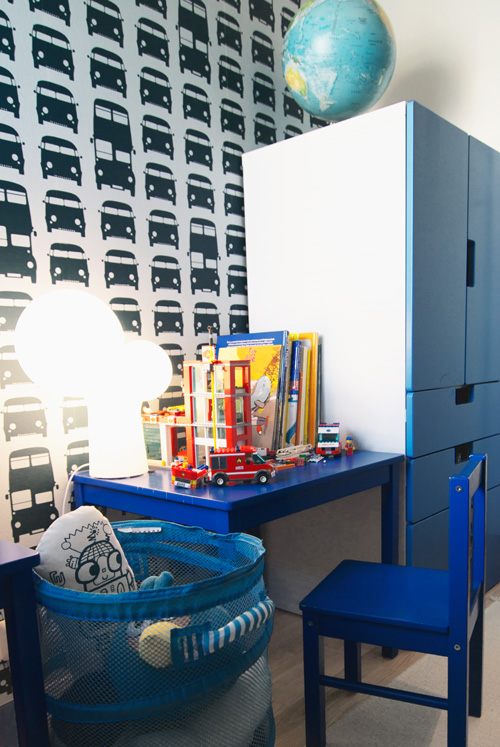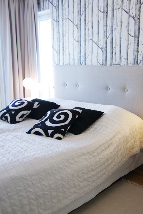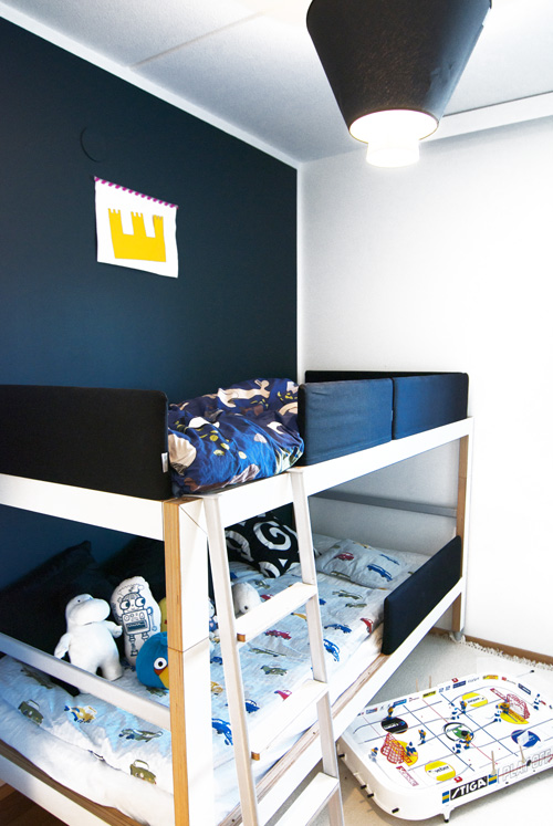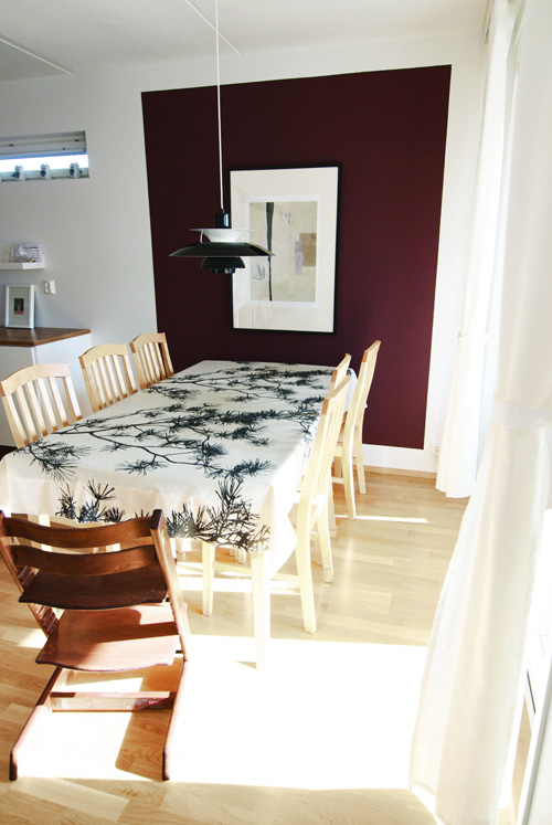 Asukkaat toivoivat kotinsa sisustukseen viimeisteltyä kodikkuutta ja tunnetta, että asiat ovat oikeassa paikassa. Tavoitteena oli se, että olemassa olevilla kalusteilla pärjätään mahdollisimman pitkälle. Asunto sai luonnetta useilla sävyseinillä - ruokailuryhmä ryhdistyi tummanpunaisella taustalla ja lastenhuoneet saivat seiniinsä tummaa sinistä ja vihreää. Vanhempien makuuhuoneessa ja molemmissa lastenhuoneissa tapetoitiin lisäksi jokaisessa yksi seinä. Lastenhuoneisiin tehtiin ehdotukset uusista verhoista ja vanhempien makuuhuoneeseen tilattiin mittojen mukaan pimentävät sivuverhot sekä ehdotetiin työpisteen päivittämistä. Eteiseen suunniteltiin kevyt säilytyskaluste-penkki, joka koottiin valmiista keittiökaapeista. Penkkiosuuteen teetettiin päällystetty patja pehmustukseksi ja seinälle lisättiin valkoinen string-hylly pikkutavaroita varten. Olohuoneen kalustejärjestys vaihdettiin ja hankittiin uusi, mukava matto.