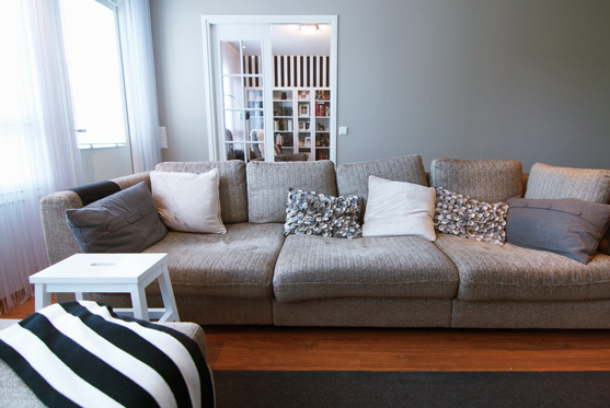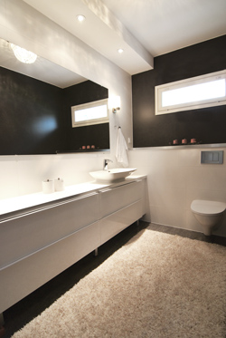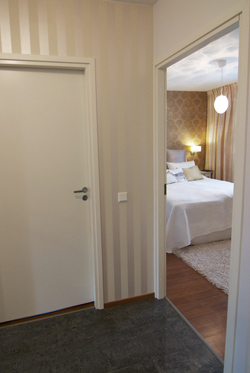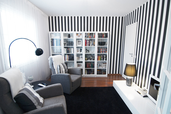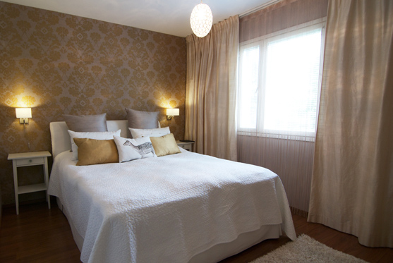 Asiakkaan kodissa olivat kaikki perusasiat kunnossa ja mieluisia, mutta maalarinvalkoisiin seiniin kaivattiin viimeistelyä, kodikkuutta, väriä ja lämpöä. Koko asuntoon tehtiin värisuunnitelmat ja asiakas toteutti maalaustyön itse. Erityisesti makuuhuoneen sisustusratkaisuihin haluttiin panostaa. Huoneesta haluttiin tehdä tunnelmallinen ja ylellinen ja sinne hankittiin uusi sänky ja sängynpääty. Seiniin valittiin näyttävä tekstuuritapetti ja ikkunoihin tilattiin vuoritetut silkkiverhot. Teimme myös ehdotukset valaisimesta. Koristetyynyt tehtiin mittatilauksena silkistä ja pellavasta ja niiden värit toteutettiin tilaan sopiviksi. Olohuoneeseen ja kirjastohuoneeseen tilattiin valkoisia naruverhoja pehmentämään kaikua ja tuomaan ilmettä. Kirjastohuoneeseen ja eteiseen valittiin rohkeat raitatapetit, joihin poimittiin asiakkaalle mieluisia sävyjä olemassa olevista sisustuksen elementeistä. Asukkaat olivat jo pitkään pohtineet sinänsä hyväkuntoisen, mutta visuaalisesti vähän kolkon wc-tilan uusimista sekä samalla tilan toiminnallisuuden parantamista. Tilaan haluttiin seinä-wc, jotta saatiin wc-istuimen paikkaa siirrettyä ja lisättyä tasotilaa. Altaan takana oleva seinä laatoitettiin kokonaan ja muihin seiniin valittiin tumma maalisävy. Kalusteet, allas ja valaistus uusittiin. Wc-remontin yhteydessä toteutettiin myös pihan sähkötöitä ja parannettiin valaistusta.