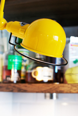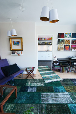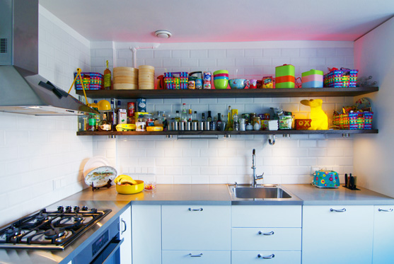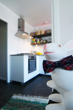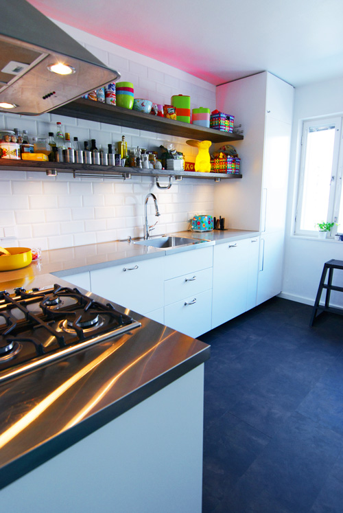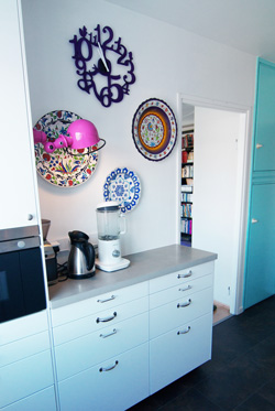 Asukkaiden toiveena oli päivittää keittiönsä ilme sekä parantaa sen toimivuutta. Keittiö haluttiin muun asunnon tyyliin sopivaksi. Remontin yhteydessä uusittiin kaikki kalusteet, kodinkoneet, sähköt, laatoitus sekä keittiön ja eteisen lattia. Eteisen seinät ja asunnon vanhat komeron ovet maalattiin. Asukkaat halusivat keittiöstään värikkään ja industrial-henkisen, 50-luvun henkeä kunnioittaen. Kaapistojen ja seinälaattojen väriksi valittiin valkoinen, väriä tuotiin värikkäillä seinävalaisimilla, säädettävillä LED-valoilla, avohyllyillä sekä maalaamalla vanhat komeronovet turkooseiksi. Teollisuus-henkeä luovat tiililadontalaatoitus isoilla seinäpinnoilla sekä betonitasot. Persoonallinen yksityiskohta on myös asukkaiden toivomat eripariset vetimet. Makuuhuoneeseen asennettiin asukkaiden valitsema tähtitaivastarra koko kattoon.